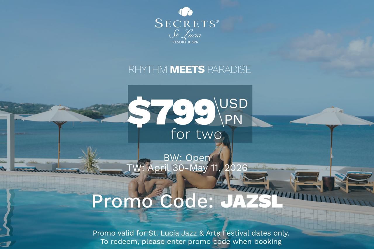*Promo is valid for ST. Lucia Jazz & Arts Festival Dates only. to redeem, please enter promo code when booking